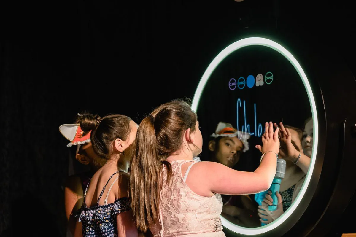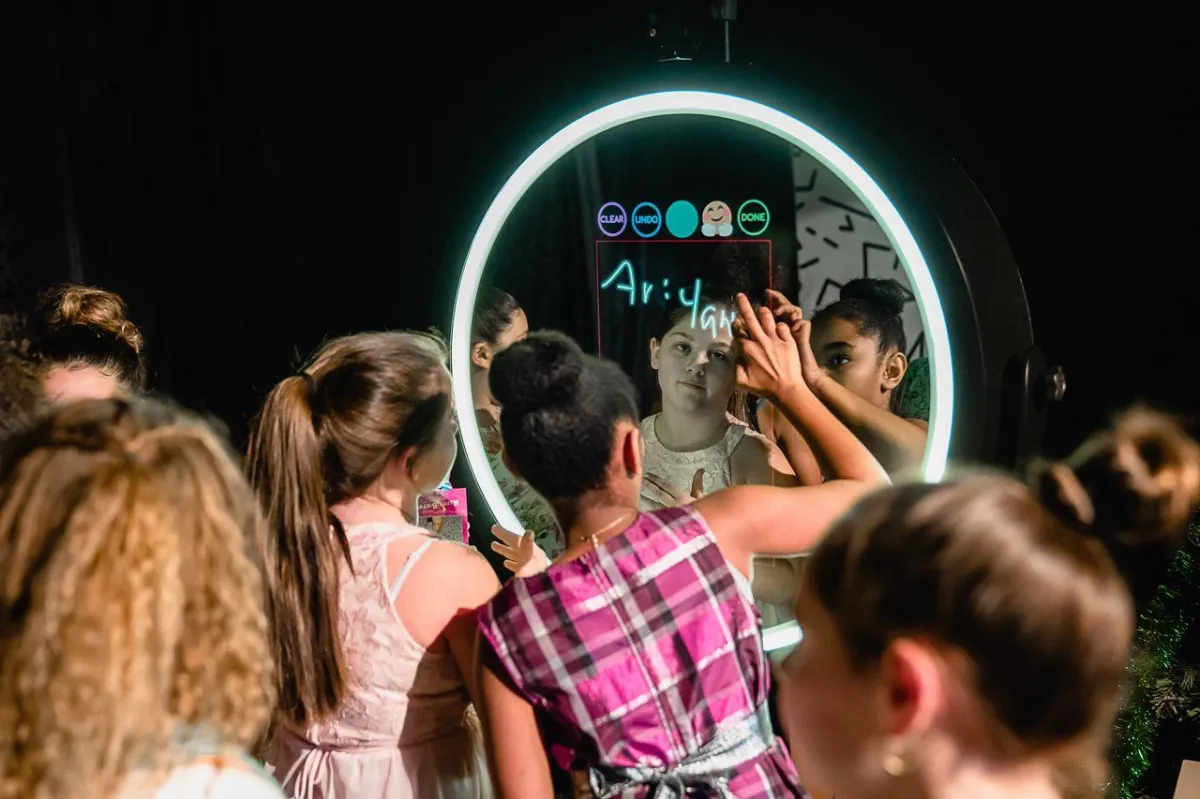 The Beauty Mirror Booth delivers a luxury photo experience with an interactive touchscreen and elegant design. Guests enjoy flawless lighting and a skin-smoothing Glam filter for stunning black-and-white portraits. Custom overlays and instant prints turn every photo into a keepsake. It’s the perfect choice for weddings and upscale celebrations that want a polished, high-end look.
